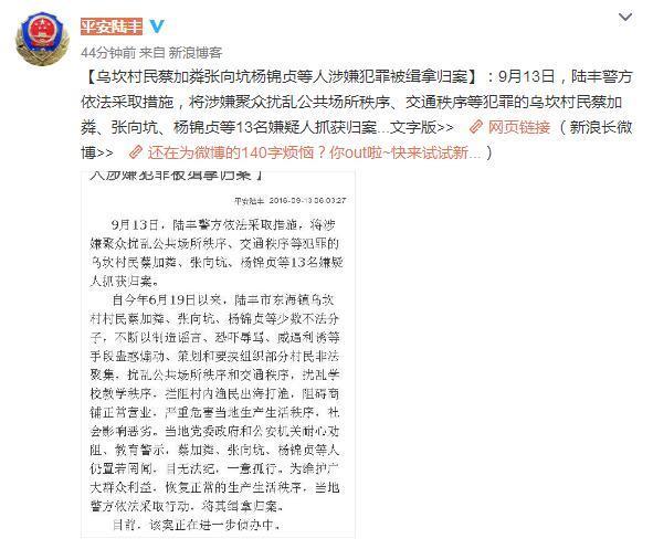 今年6月19日以来,陆丰市东海镇乌坎村村民蔡加粦、张向坑、杨锦贞等少数不法分子,不断以制造谣言、恐吓辱骂、威逼利诱等手段蛊惑煽动、策划和要挟组织部分村民非法聚集,扰乱公共场所秩序和交通秩序,扰乱学校教学秩序,拦阻村内渔民出海打渔,阻碍商铺正常营业,严重危害当地生产生活秩序,社会影响恶劣。当地党委政府和公安机关耐心劝阻、教育警示,蔡加粦、张向坑、杨锦贞等人仍置若罔闻,目无法纪,一意孤行。为维护广大群众利益,恢复正常的生产生活秩序,当地警方依法采取行动,将其缉拿归案。 |