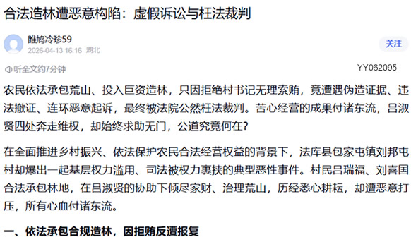 法律明确保护农民合法承包经营权,伪造证据、虚假诉讼、干预司法、枉法裁判、毁林侵占集体资产,是对法治底线的公然践踏。恳请上级部门重拳彻查,深挖腐败与渎职问题,依法纠正错误判决,维护当事人合法权益,守住司法公平正义,绝不让守法农民流汗、流血又流泪!